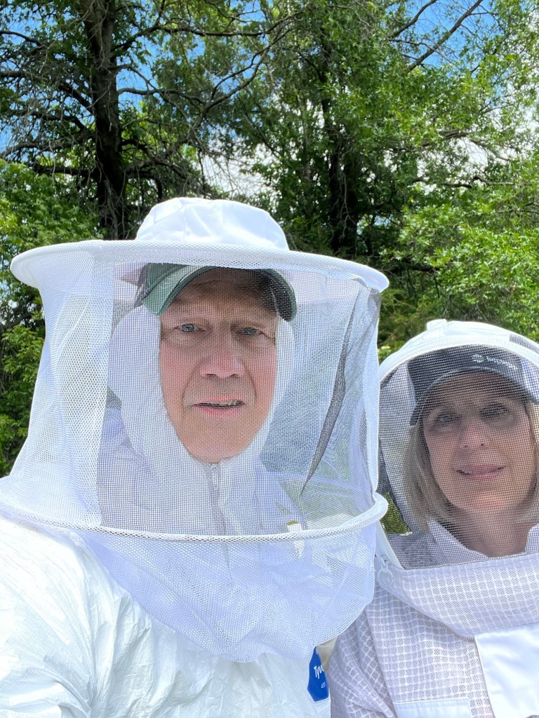 This morning we both suited up and delivered 2 gallons of sugar water to our newly placed hives. Early in the season, it’s good to provide the bees extra sugar sources. They use it to build comb as they expand into a much larger hive and start multiplying like crazy for the summer’s work ahead.